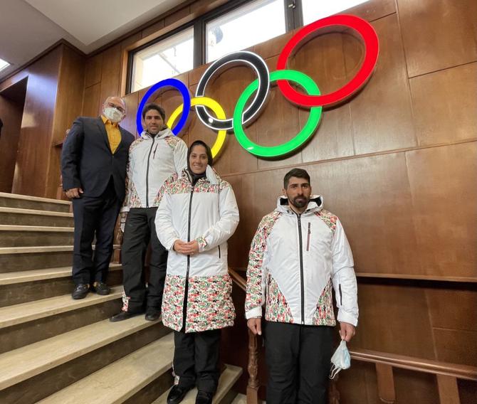 1月24日,伊朗男子高山滑雪运动员侯赛因·萨韦·谢姆沙基(左二)、女子高山滑雪运动员阿提法·艾哈迈迪(右二)、越野滑雪运动员赛义德·萨塔尔·赛义德(右一)展示参赛服装。新华社记者 高文成摄