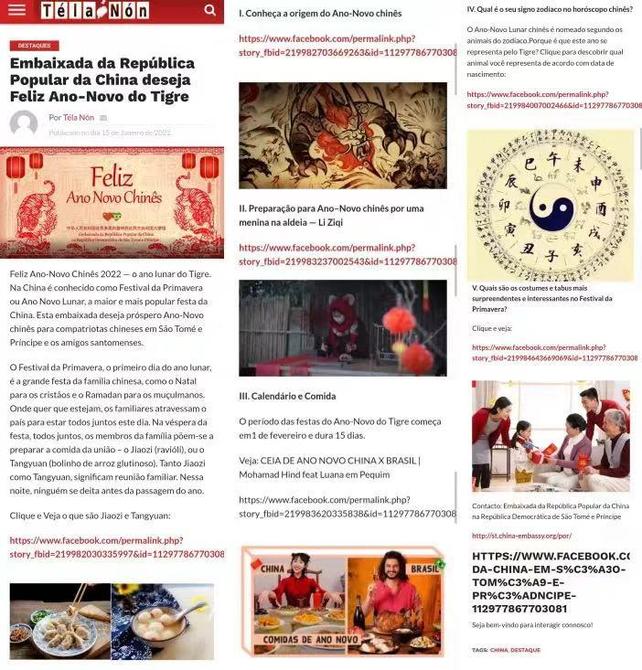 春节前夕,中国驻圣多美和普林西比使馆在当地主要门户网站特拉侬网(Téla Nón)设立虎年春节专栏,向广大旅圣普侨胞、中资机构和留学生以及圣普人民送上新春祝福,并介绍中国春节习俗趣事,掀起迎接中国新年的热潮。