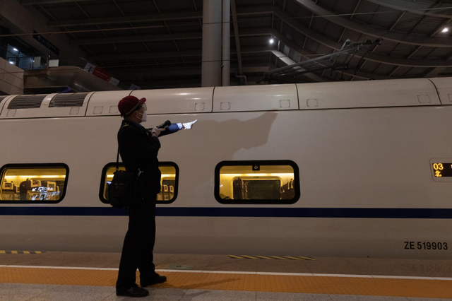这是春运期间孙玮纵的上班日常。从1月20日晚9点至22日晚9点,48小时内,作为一名随车机械师,孙玮纵每天车上车下来回巡检,日行两万余步,每次车辆行驶时,他得时时观察车辆运行情况以及车内状况,动车到站后则赶紧下车巡检车辆外部,精神始终高度集中。