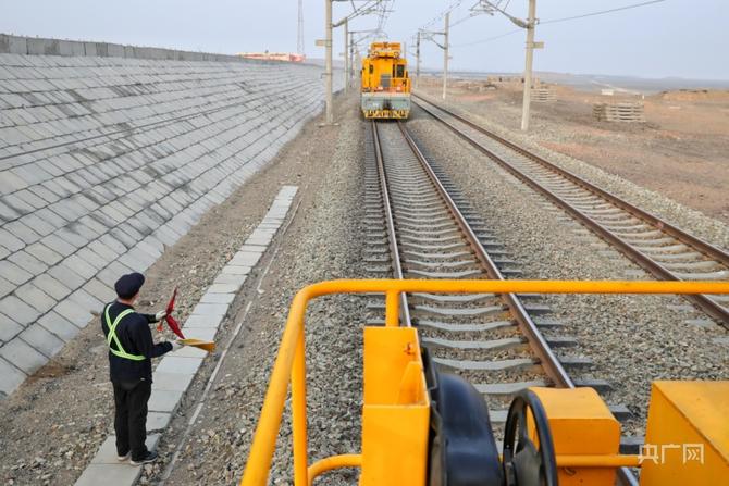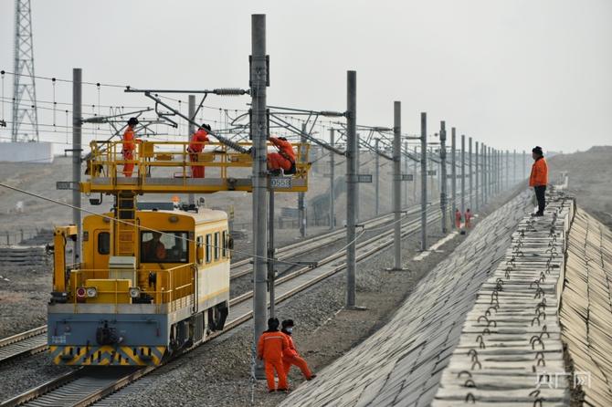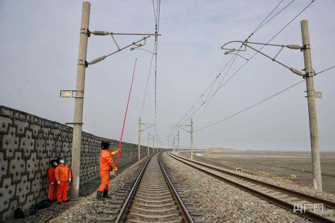 在南疆铁路鱼儿沟至望布区段,作业进行接触网验电。摆风亮摄 央广网发