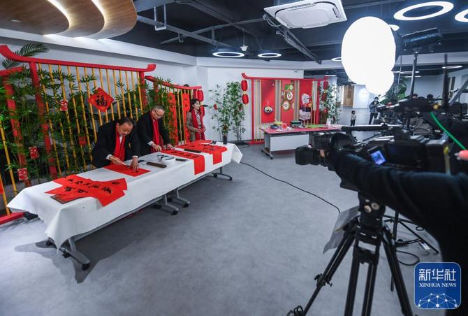 ↑1月26日,参加村晚直播的书法爱好者在书写春联。
