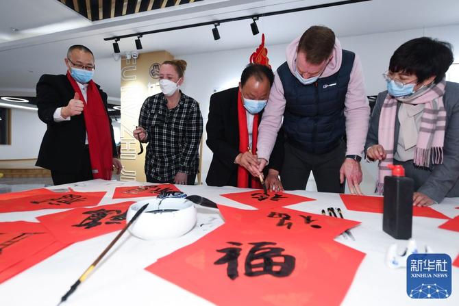 ↑1月26日,在中泰街道工作和生活的外籍居民在“云上村晚”活动现场学习写福字。