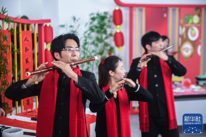 ↑1月26日,参加村晚直播的居民在吹奏竹笛。