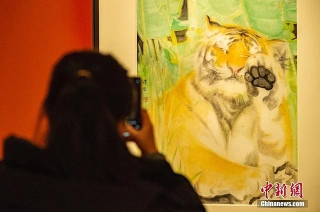 1月21日,中国农历虎年渐近,市民在位于北京的中国国家博物馆的“瑞虎佑安——二〇二二新春展”上欣赏《猛虎半日闲》画作。中新社记者侯宇 摄
