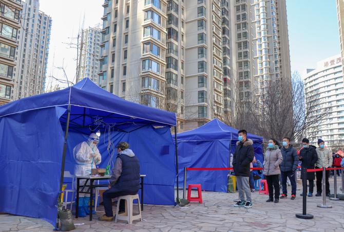 ↑1月27日,在天津市河北区光复道街道某社区核酸采样点,居民排队进行核酸检测采样。