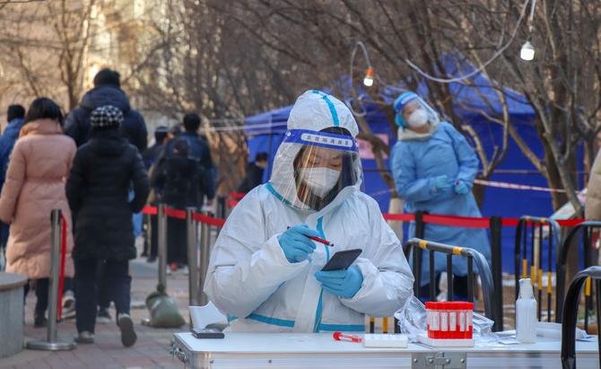 ↑1月27日,在天津市河北区光复道街道某社区核酸采样点,工作人员为居民进行核酸采样。