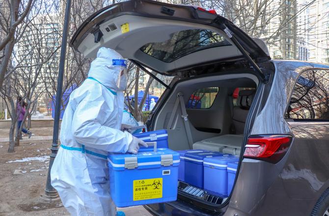 ↑1月27日,在天津市河北区光复道街道某社区核酸采样点,工作人员将核酸样本转运装车。