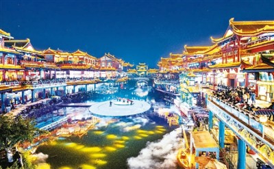春节前夕,四川省眉山市穿越城水街上演水上文艺演出。刘国兴摄(人民图片)