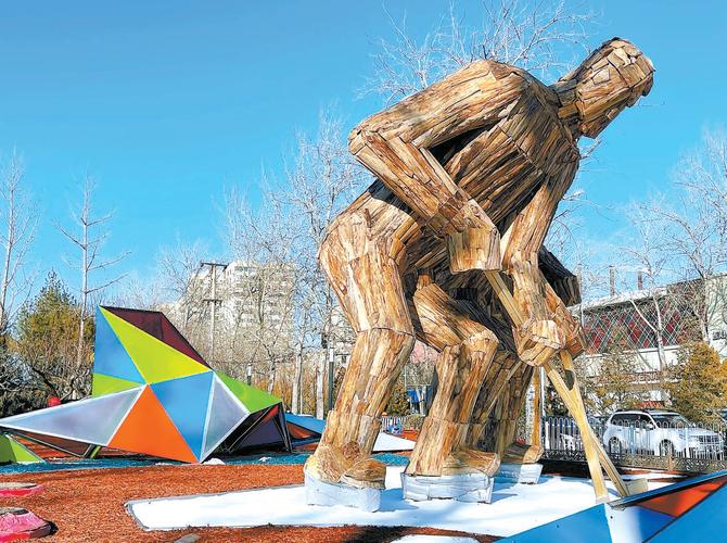这两天,两位6米高的“冰球运动员”在北京市海淀区五棵松冰球馆南侧绿地上玩起了“对抗”——这是目前国内单体体量最大的冬奥地景雕塑景观,光木块就用了2万多块12立方米。