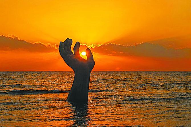 朝鲜半岛史学家崔南善曾将朝鲜半岛的版图形状比作一只老虎,位于韩国庆尚北道的浦项有个虎尾岬,又名虎尾串,正如其名指的是这只老虎尾巴向上翘起的部分。由于其地理位置位于韩国陆地最东端,这里的每一个清晨都可以迎接属于这个国家的第一缕阳光。有意思的是,在这里伴随着太阳共同升起的,有座名为“相生之手”的巨大雕像,是浦项的代表。每当太阳冉冉升起至一定角度时,便会演绎出太阳被相生之手托起的奇妙风景(如图),寓意着“托起太阳,托起希望”。每到新年前夕,这里都会人潮汹涌,人们齐聚虎尾岬共迎新年的第一轮红日,祝福新年,感受温暖。