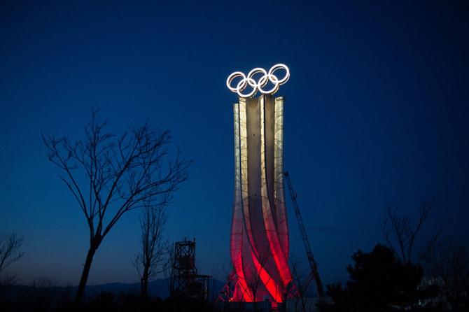 这是1月26日拍摄的亮灯的海陀塔。北京冬奥会标志性景观建筑“海陀塔”于本月25日在北京延庆正式竣工亮相。该建筑在120米塔顶装设巨型奥运五环标志,成为公众临近延庆赛区、经行京张高铁线或京礼高速线时一道靓丽的风景。(新华社记者陈钟昊摄)