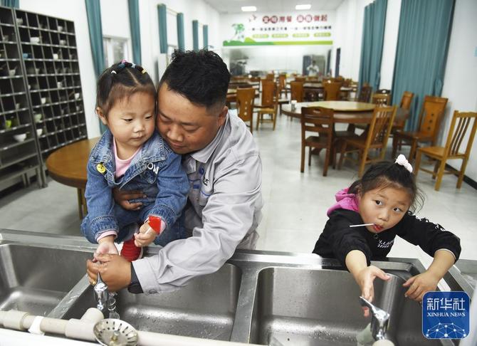 ↑从施工现场回来,杨兴义在食堂为小女儿洗手(1月24日摄)。新华社记者田建川摄