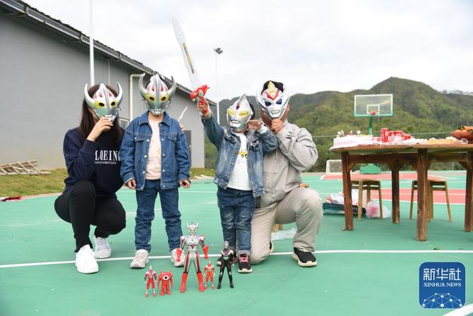 ↑小女儿(右二)生日当天,杨兴义为她买了最爱的玩具(1月25日摄)。新华社记者田建川摄