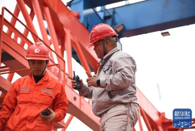 ↑杨兴义(右)在施工现场指引设备下桩(1月25日摄)。新华社记者田建川摄