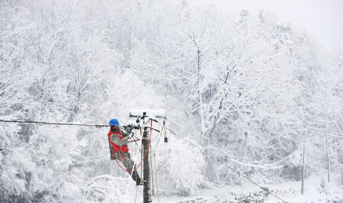 新华社武汉1月28日电 记者侯文坤 “快点搞!等会雪又要下大啦!”湖北省荆门市荆山余脉海拔500多米的裴山村,风雪呼啸,一声呼喊响彻山间。白茫茫中,几抹红色格外醒目,那是正在进行抢修的国网荆门供电公司栗溪供电所的电力工人。