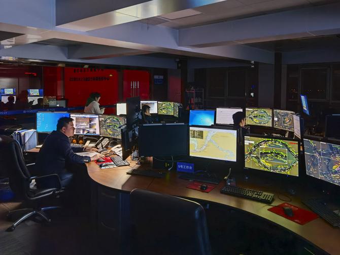 镇江海事局指挥中心工作人员通过视频监控巡查江面。新华社记者杨绍功 摄