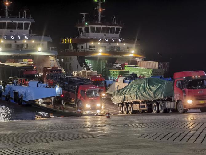 深夜的镇扬汽渡扬州一侧,车辆正驶下渡轮。新华社记者杨绍功 摄