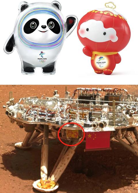 在着陆器下方,五星红旗的左侧是2022年北京冬奥会吉祥物图案