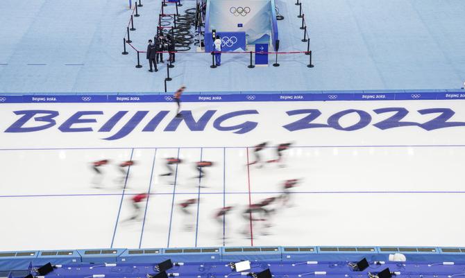 1月28日,速度滑冰运动员在国家速滑馆“冰丝带”训练。新华社记者王菲摄