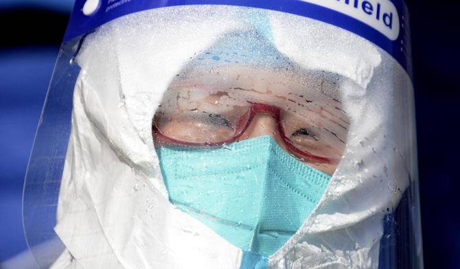 北京,2022年1月25日,工作中的一名医护人员的防护面罩上挂满水雾。新华社记者李欣 摄