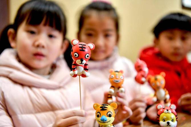 2022年1月18日,在安徽省亳州市花戏楼景区国艺面塑馆,小朋友展示刚捏制好的萌虎面塑。新华社发(刘勤利摄)