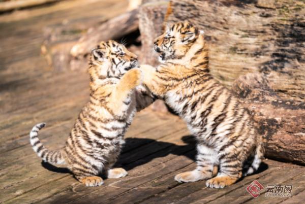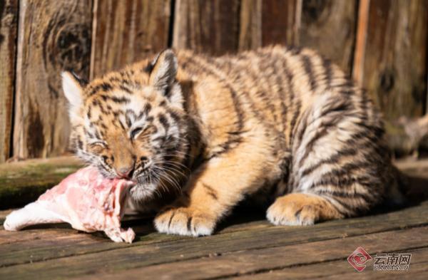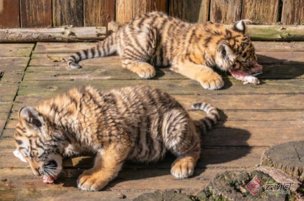 在云南野生动物园狮虎山庄,已经三个月大的“虎姐妹”一看到特地准备的鸡腿就兴奋不已,两个小家伙打闹着迎接这顿“年夜饭”。饲养员介绍,随着小老虎逐渐长大,它们的饮食也随之调整,最近一段时间,两只小老虎平时都是吃小鸡腿,像今天特地准备的大鸡腿两个小家伙需要至少半个小时才能吃完。目前两只小老虎还不能把骨头嚼碎,但再过两个月,它们的撕咬能力就能连肉带骨一并吃下了。
