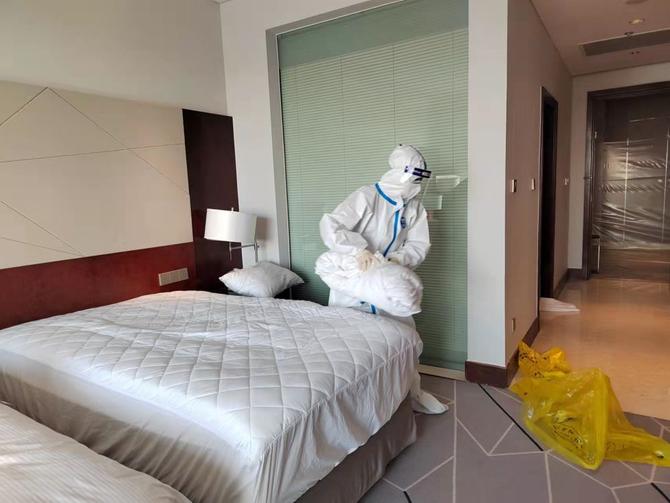 “除了干净温馨的客房环境,安全还是大家最关心的问题。”客房部主管张继芹介绍,每天上岗前,她们必须要做到一级防护,完整穿戴好防护服、头套、N95口罩、手套、鞋套、护目镜等“防护六件套”。