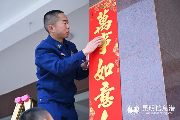 营区里到处都是消防员热情洋溢的面孔,他们充分发挥自己的想象力和创造力,将富有年味的红灯笼、拉彩条、剪纸、窗花等火红鲜艳的色彩布满营区的每一个角落,一个个大红灯笼高高挂起,一面面彩旗迎风飘扬,一幅幅春联喜气洋洋,简朴而又热烈的新春节日氛围深深地感染了每一名官兵。(昆明信息港 记者合宇聪 通讯员张如锋 周瑞祺)