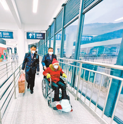 车站客运人员热心服务重点旅客出站。 杨紫轩摄(人民视觉)