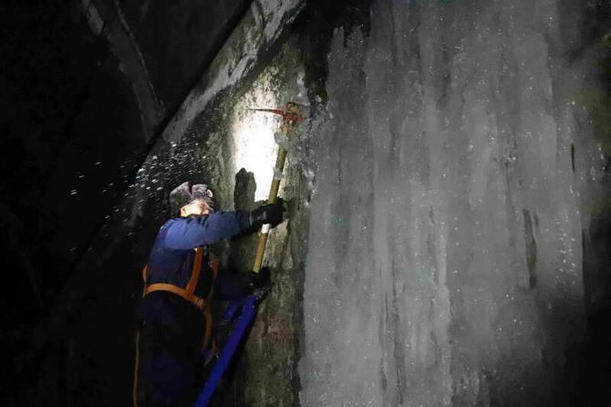 “打冰看起来简单,其实并不容易。我们用的打冰杆,由3段绝缘杆组成,如果掌握不好角度和力度,掉落的冰块和锋利的冰碴会伤到自己。”队员刘洪斌除完隧道边墙下壁冰面后,又换上长把除冰镐接着敲打冰柱。