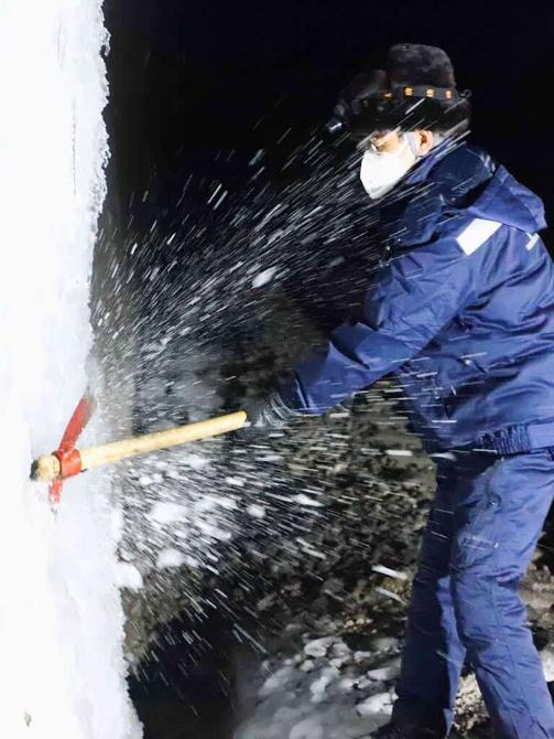 7点30分,天还未亮,“打冰队”队员们已经带好打冰杆、除冰镐、梯子等作业设备,离开工区,开始一天的工作。