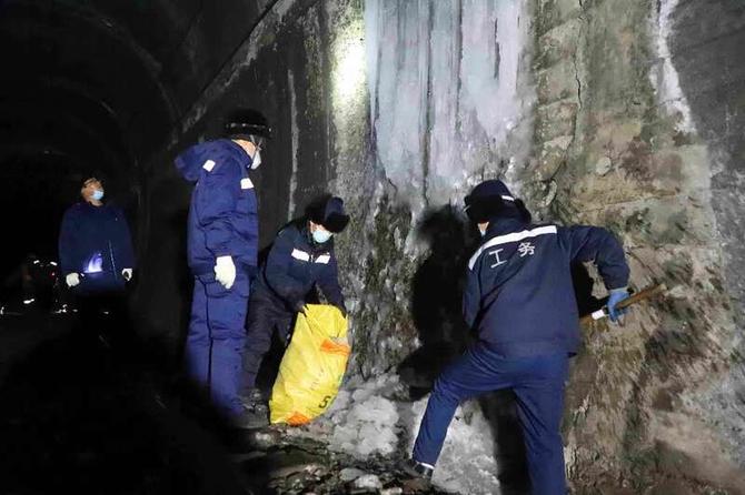 就这样,周而复始地打冰、清理冰块,在结冰处撒盐加速冰的融化,减缓再次结冰的速度。清除下来的冰块还要用编织袋运送到隧道外的安全处所。随着气温逐渐走低,冰点再次结冰的速度变得越来越快,从刚入冬时的每间隔一天打一次,变成了现在的每天打一次。