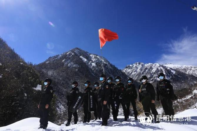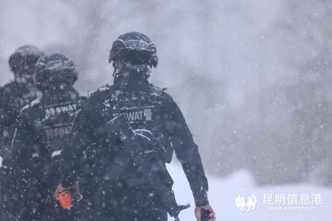 大雪下了一夜,现在依然不停,一脚踩上去,整条小腿都陷在雪中,由扛着国旗的队员带队,后面的人踩着前面的人的脚印,大家摇摇晃晃往前走,已经顾不上队列的整齐。往前走一段,大家就停下来休息几分钟,看见几个队员没戴护目镜,带队民警老杨大声提醒:“大家把护目镜戴好,小心雪盲症!我以前就着过道,老火得很!”