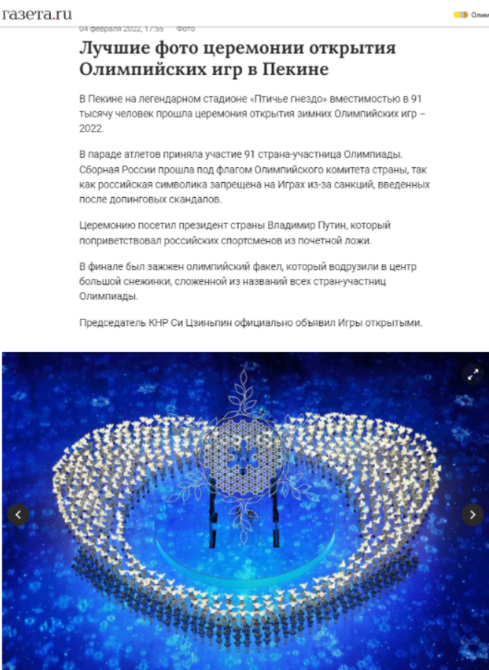 4日当天,俄罗斯第一频道(1tv.ru)对开幕式进行了全程直播,俄新社、《俄罗斯报》等媒体则在网站版面头条位置进行了图文直播报道。俄塔社、《俄罗斯报》、连塔网等多家媒体对开幕式全程进行了回顾报道,并冠以“北京冬奥会开幕式的精彩瞬间”等标题。