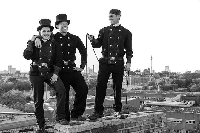 在德国,烟囱清扫工非常有辨识度,他们统一穿着带有金色纽扣的黑色制服,佩戴黑色帽子,连鞋袜也是黑的。这些工装不只在设计上美观有型,更重要的是材质轻便结实,而且能够防止酸性物质以及阻挡风雨。清扫工们的两件“法宝”,一是长梯子,二是一根拴着金属球和球形铁刷子的粗绳。只要站在屋顶上,把金属球和铁刷投进烟囱,再上下拉动绳子,不用钻进烟道就可将烟囱打扫干净。此外,现代清扫工都会配备防尘口罩、手套、护手霜等实用小物品。
