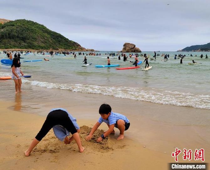 2月3日三亚后海,孩童们在挖沙、冲浪。 王晓斌 摄