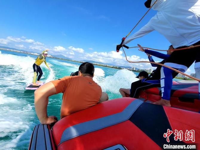 尾波冲浪是三亚近年来冒出的热门玩法。在三亚湾,船舷两侧夹带冲浪板的造浪艇,就像跃出水面的飞鱼,在广阔海面来回穿梭。7岁小朋友董任博宇踩着冲浪板,已经学会不需要绳索牵引,单凭造浪艇造出的浪就能轻松滑行。他13岁的姐姐任薏帆则可以跃过一个浪后,接着挑战下一个浪头。