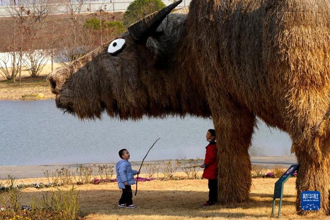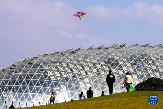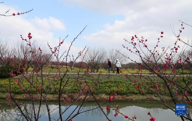 2月4日,游人在上海金山区花开海上生态园内游玩。