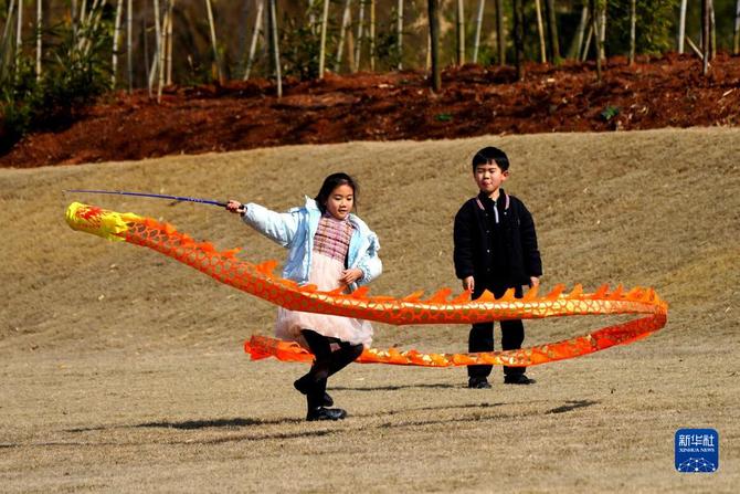 2月4日,小朋友在上海辰山植物园玩舞龙。