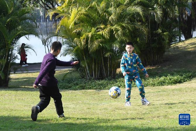 2月4日,小朋友在广西南宁市南湖边的草地上玩耍。