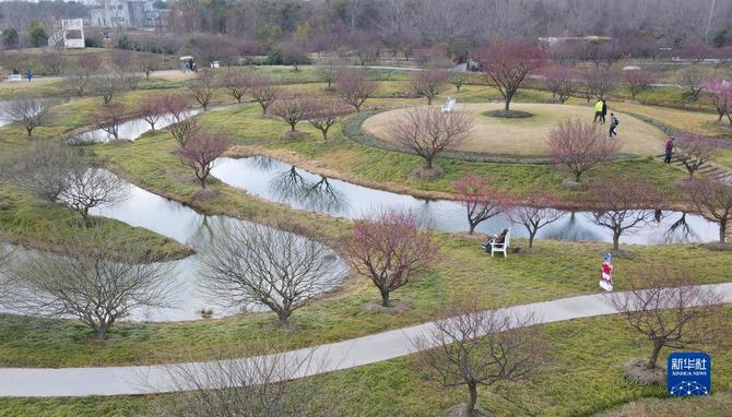 2月4日,游人在上海金山区花开海上生态园游玩赏花(无人机照片)。