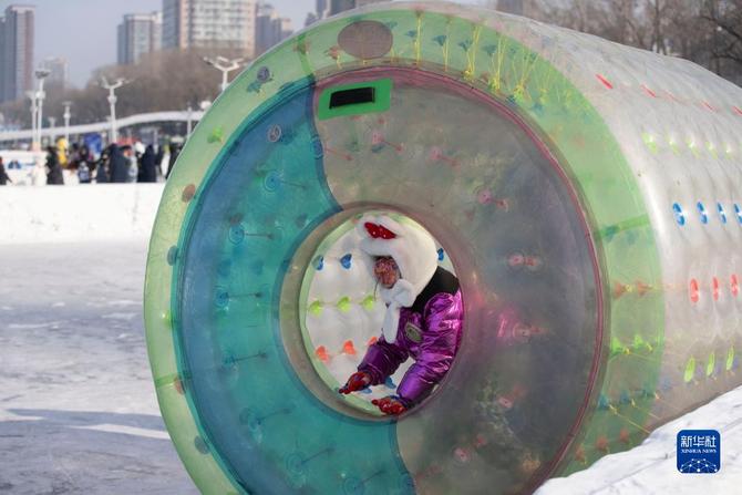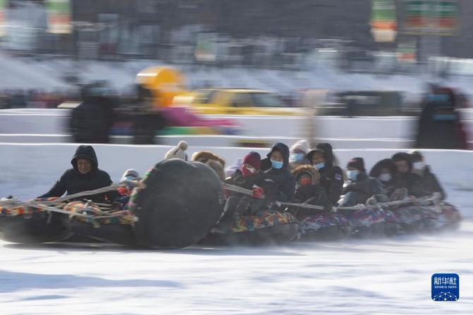 游客在哈尔滨松花江冰雪嘉年华园区体验冰雪娱乐项目。