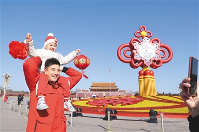 北京冬奥会脚步临近,北京市内各处冬奥城市景观已准备就位,营造出浓厚的冬奥氛围。图为1月29日,市民在位于北京天安门广场的“精彩冬奥”主题花坛前拍照留念,喜迎北京冬奥会。