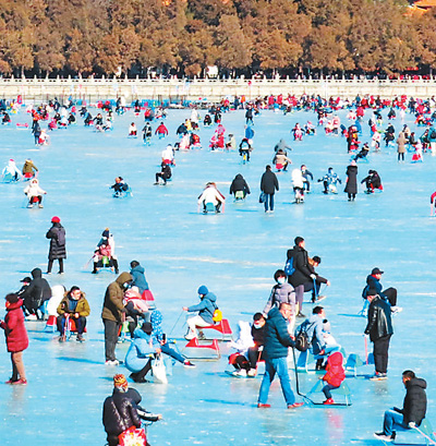 北京颐和园天然冰场,人们在享受滑冰的乐趣。