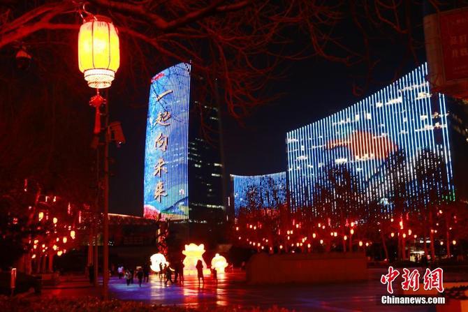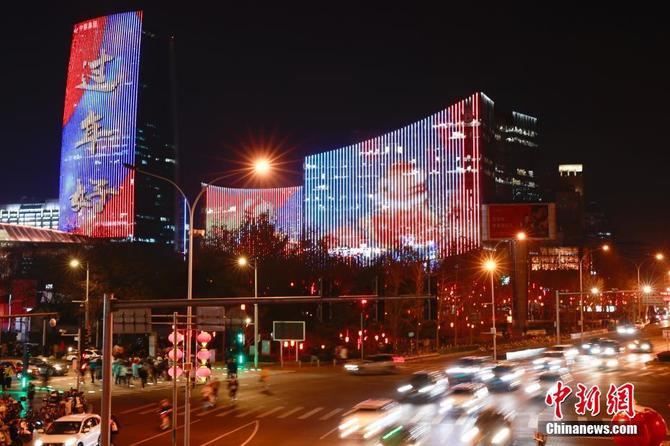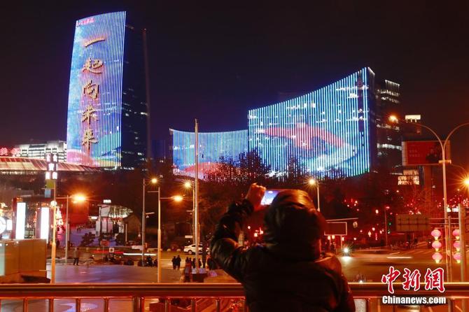 1月29日,北京中关村新年灯光秀“点亮”中关村大街。灯光秀通过《福虎献瑞》、《阖家团圆》、《燃动冰雪》三个主题篇章,运用喜庆、欢乐、科技的表现手法,彰显中华年俗文化丰富的内涵与文化底蕴,同时展现北京冬奥会的人文精神。 中新社记者 盛佳鹏 摄