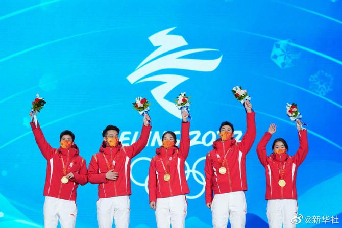 中国短道速滑队登上最高领奖台