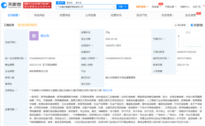 2月8日消息,天眼查App显示,近日,广东美的智慧家零售有限公司、广东美的智慧家科技有限公司成立,法定代表人均为殷必彤,注册资本分别为1亿人民币、1000万人民币。