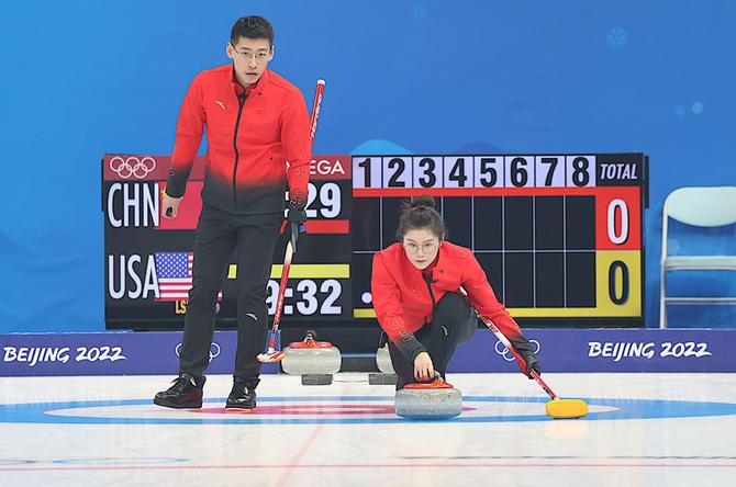 2月5日,中国队选手范苏圆(右)和凌智北京国家游泳中心“冰立方”比赛中。中国日报记者 冯永斌 摄