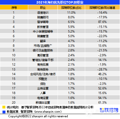 文体教育行业海归优先职位占比最高,为34.9%。IT互联网、商业服务、金融业对海归的需求量也较大,海归优先职位分别占19.3%、13%、11.3%。受“双减”政策影响,2021年教培业招聘需求骤降,文体教育行业的海归优先职位同比减少13.1%。相对而言,IT互联网、商业服务行业海归岗位均同比增长15%以上,这对正在求职的海归来说是不错的选择。