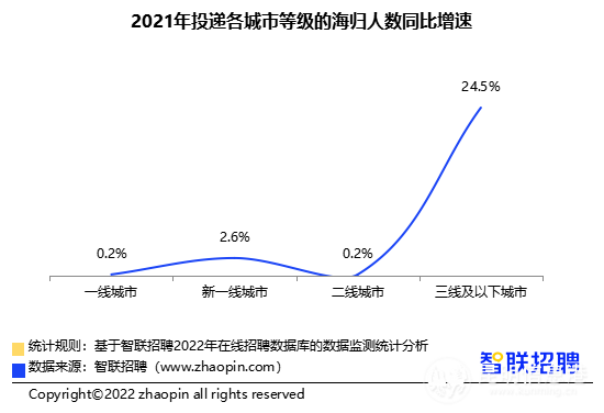 2021年,向新一线城市投递简历的海归人数同比增长2.6%,新一线城市发展潜力大,基础设施完善,具有很强的人才吸引力。不过,海归群体前往三线及以下城市发展的意愿明显增强,去年向三线及以下城市投递求职简历的人数同比增长了24.5%。